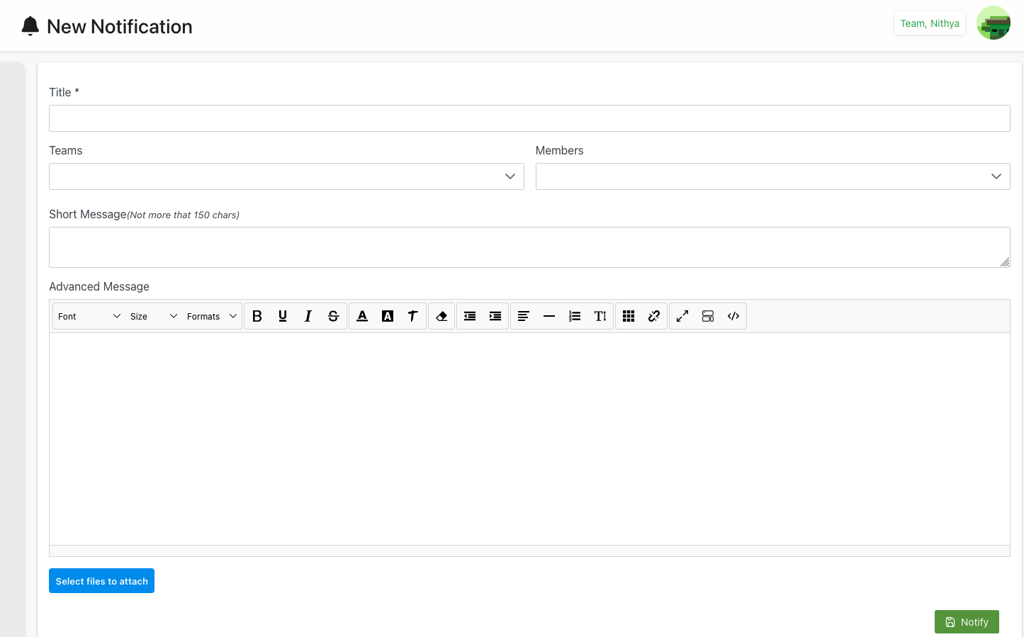 The Create Notification form provides a comprehensive interface for composing and sending email communications to selected teams and members. The form supports both simple text messages and advanced HTML-formatted content with file attachments.