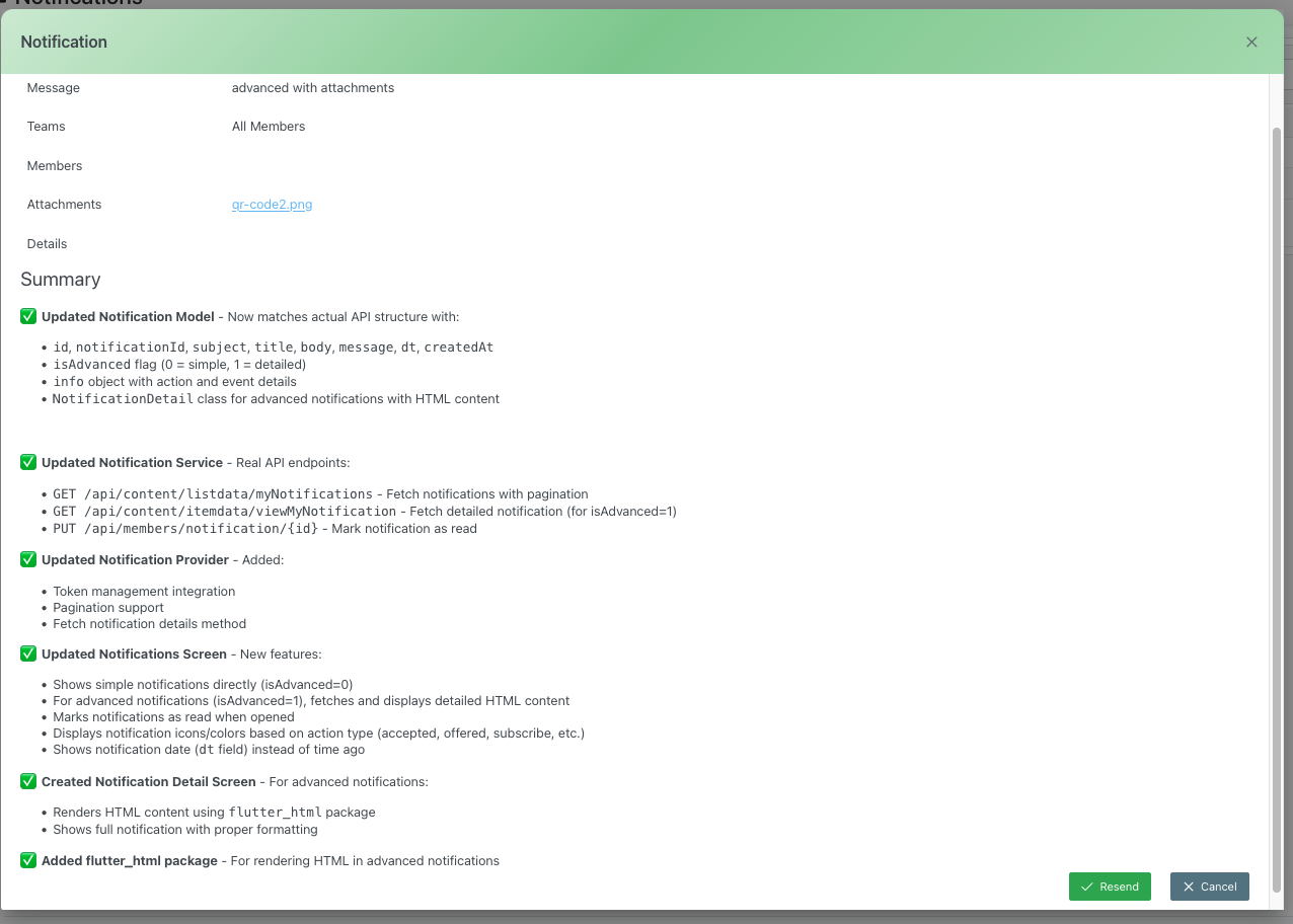 View complete details of a sent notification, including recipients, message content, attachments, delivery status, and technical information. Optionally resend the notification.