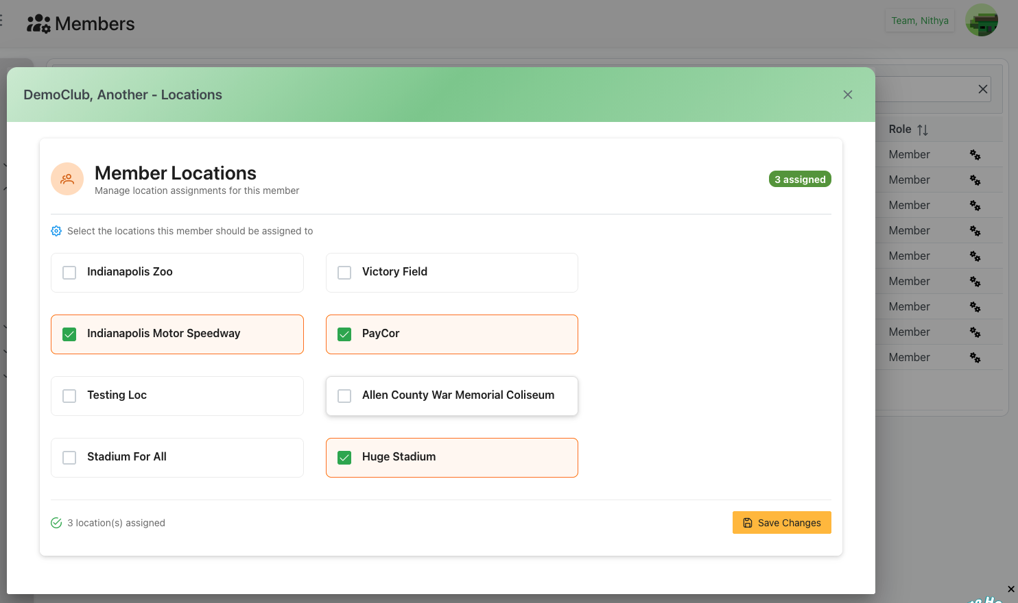 The Member Locations dialog provides an interface for administrators to assign specific locations to members. This controls where members can schedule events, access facilities, and operate within the organization's venues.