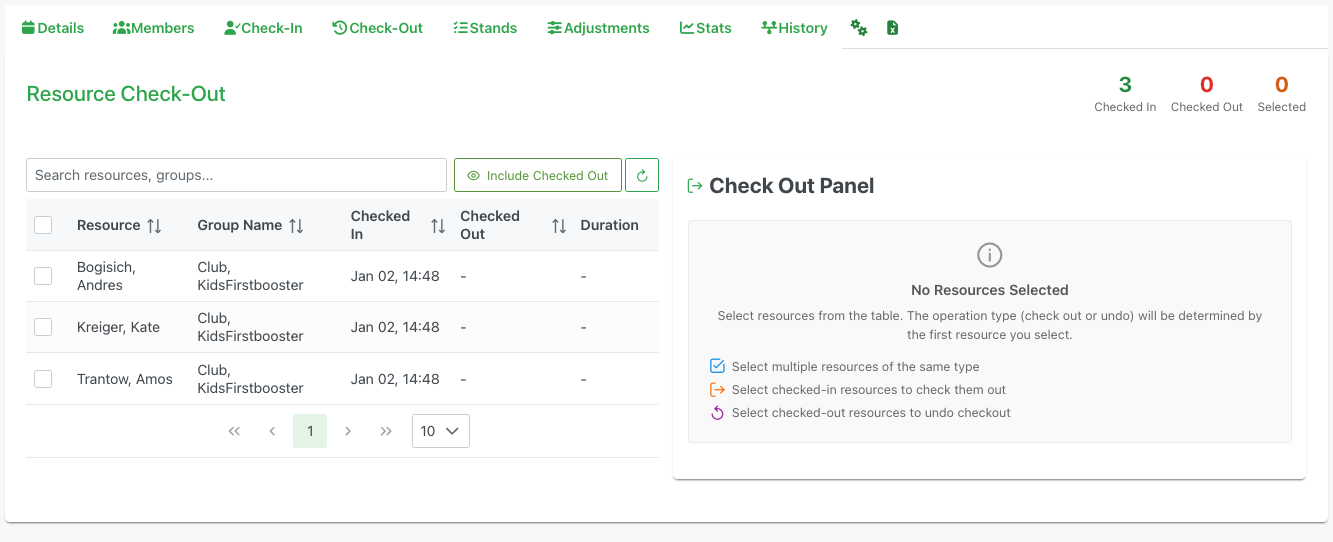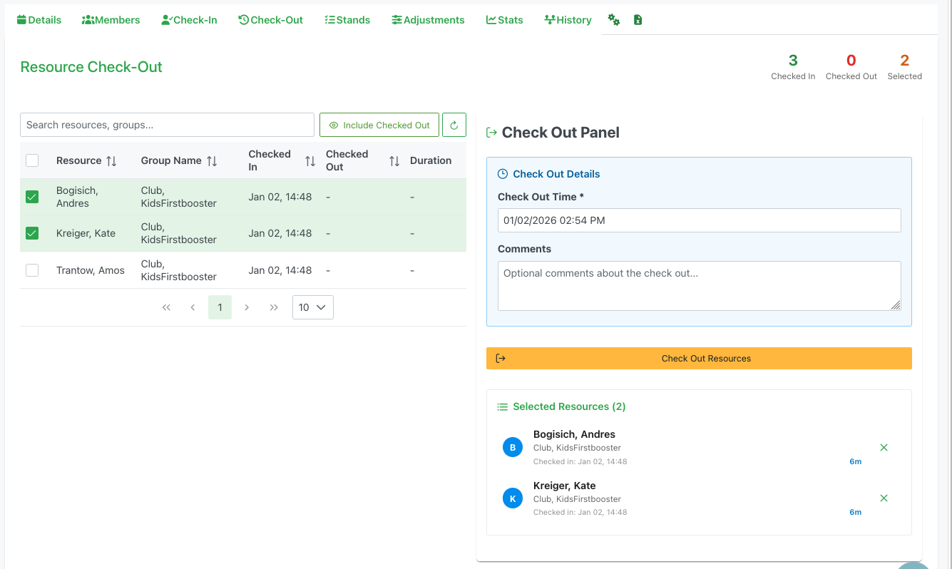 The Check-Out tab allows organizers to track and record member departures from the event. It provides tools for checking out resources, viewing their duration on-site, and managing undo operations for accidental check-outs.