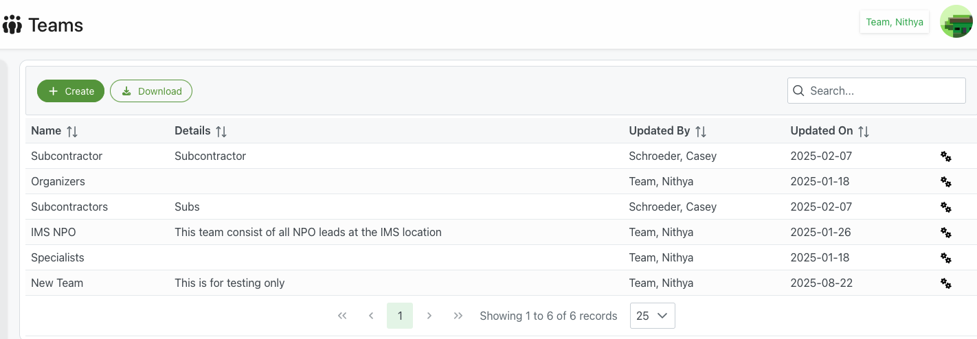 The Teams page provides a centralized interface for creating and managing teams across your organization. Teams can be used for various purposes including scheduling coordination, permission management, resource allocation, and organizational structure.