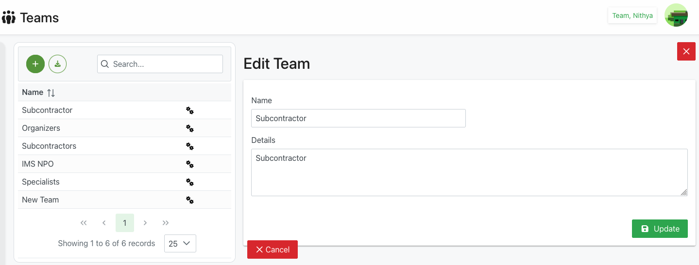 Create new teams or edit existing team information including name and description details.