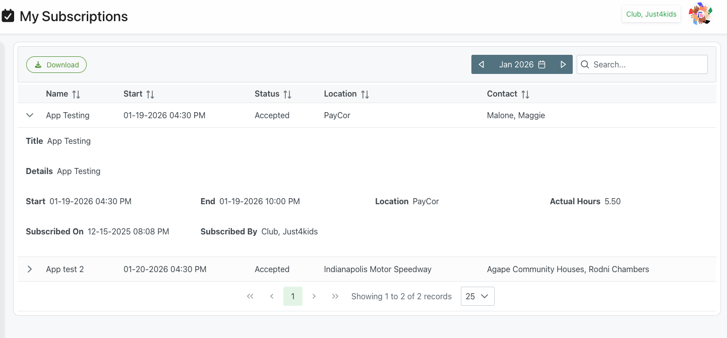 The My Subscriptions page provides members with a comprehensive view of all their event subscriptions. Members can see upcoming events they've accepted, review event details, track hours worked, and manage their commitments. The interface offers filtering, searching, and detailed information about each subscribed event.