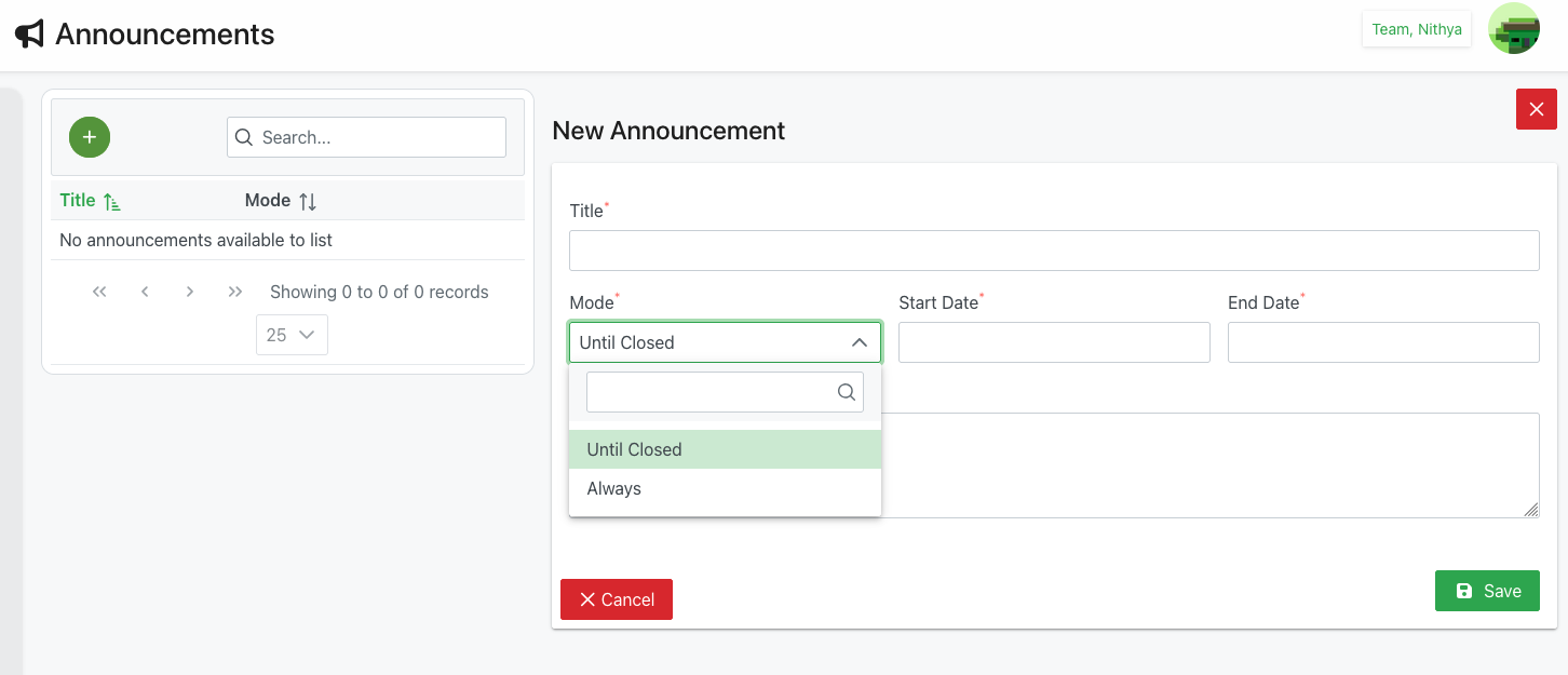 Create and manage organization-wide announcements that display as a banner marquee at the top of all pages throughout the application. Announcements are visible to all users until closed or expired.