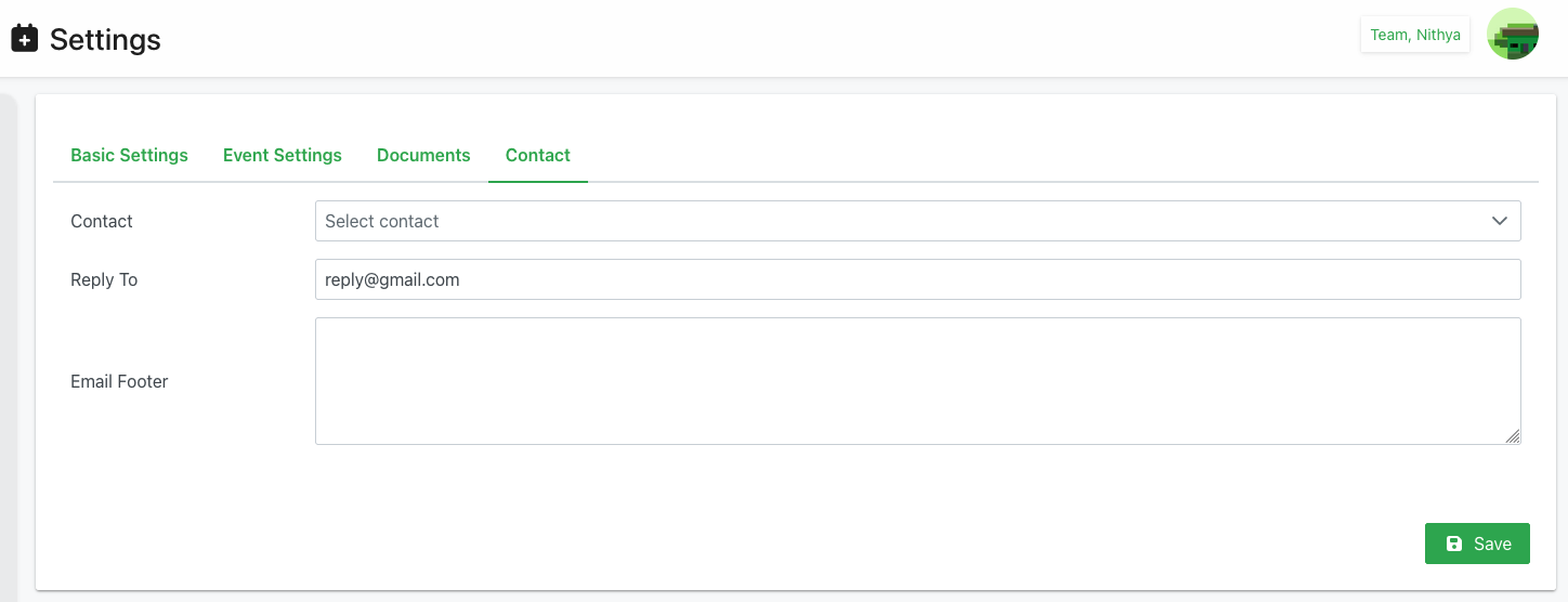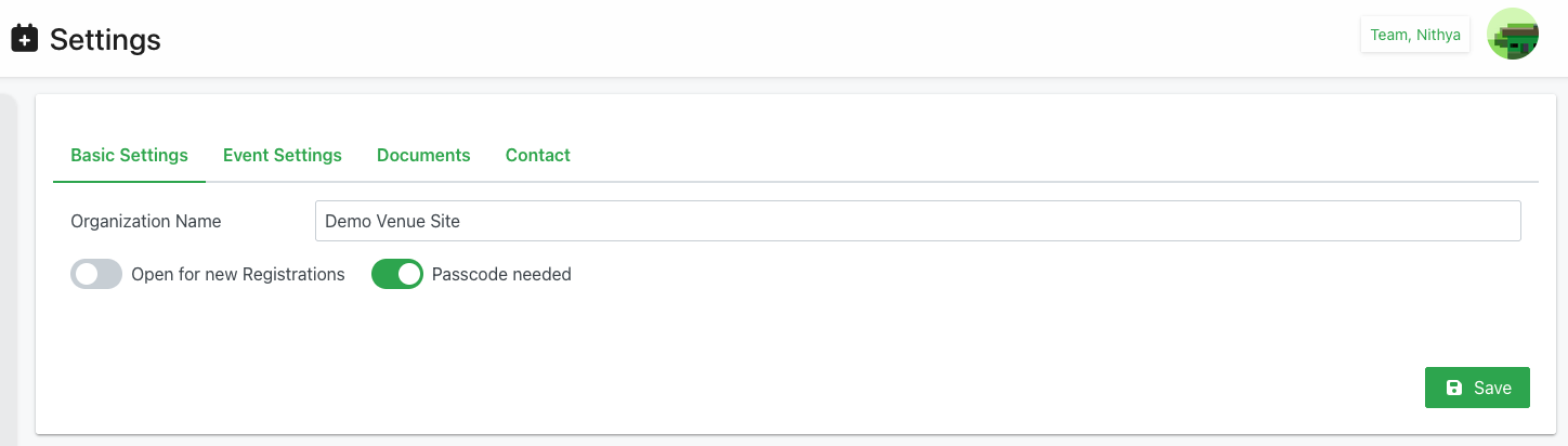 The Settings page provides centralized configuration for the organization's scheduling system. Settings are organized into four tabs: Basic Settings, Event Settings, Documents, and Contact. Changes to settings affect the entire organization and typically require administrator permissions.