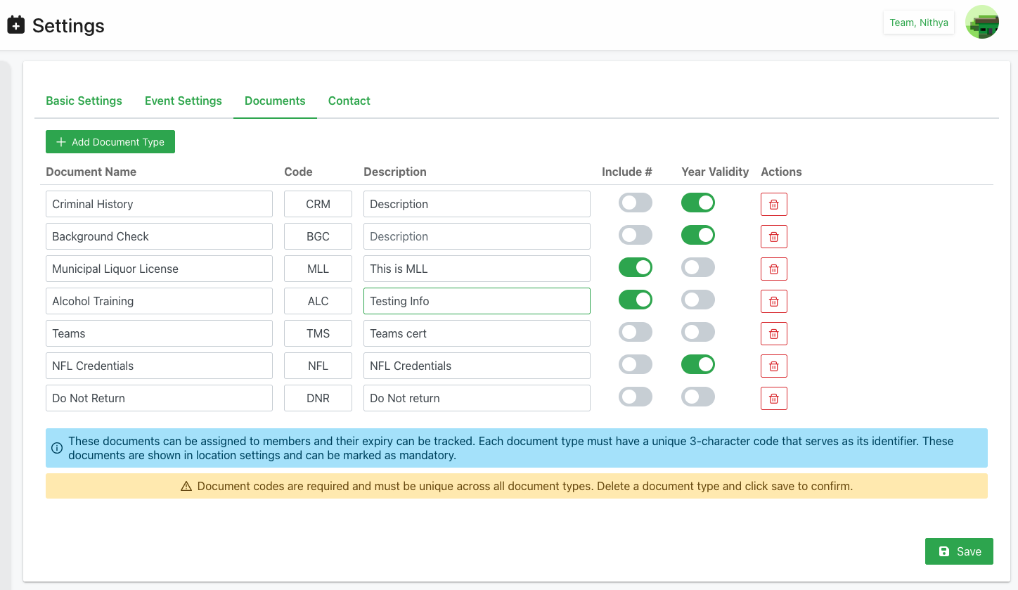 - 3-Character Codes: Document codes must be exactly 3 characters and unique